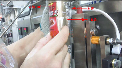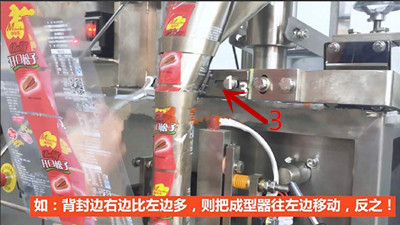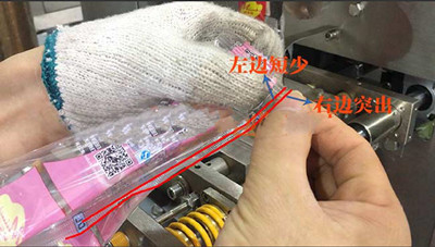 1)包裝膜安裝好后,開機測試,包裝膜制袋后,出現(xiàn)如下圖包裝袋背面封口左邊袋子邊比右邊袋子邊短小的情況。接下來根據(jù)包裝膜拉膜跑偏的情況調(diào)節(jié)包裝機的成型器。
